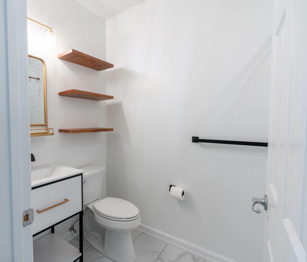 Elegant bathroom with custom built in shelves and a modern vanity.