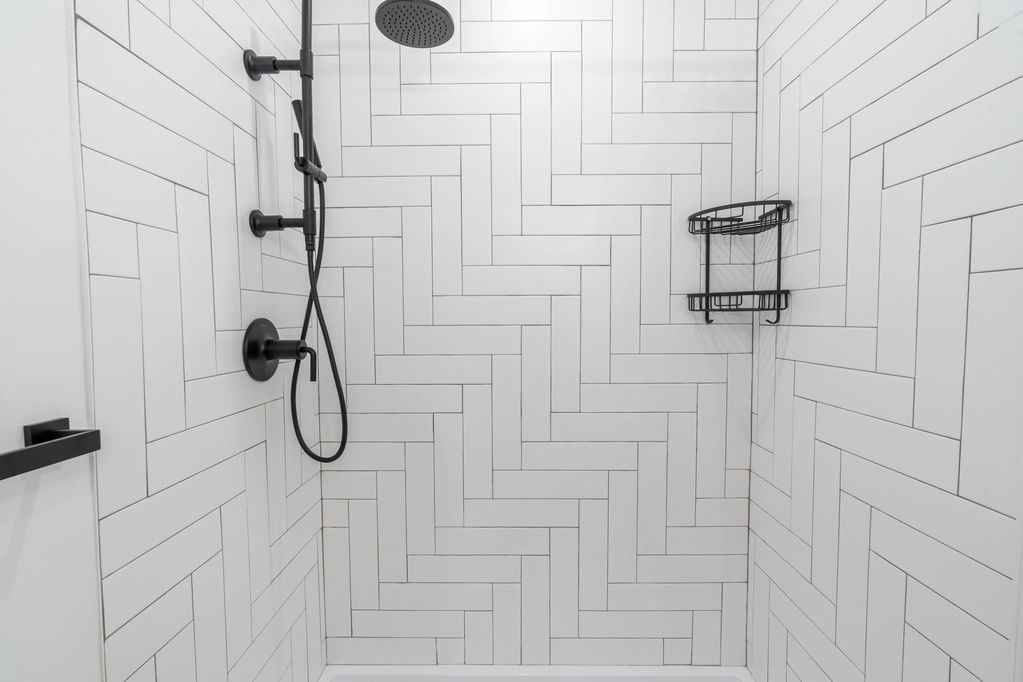 Herringbone tiled walk in shower with built in shelves, recessed lighting, a tiltable rain shower head and an adjustable handheld shower wand.