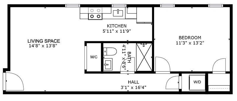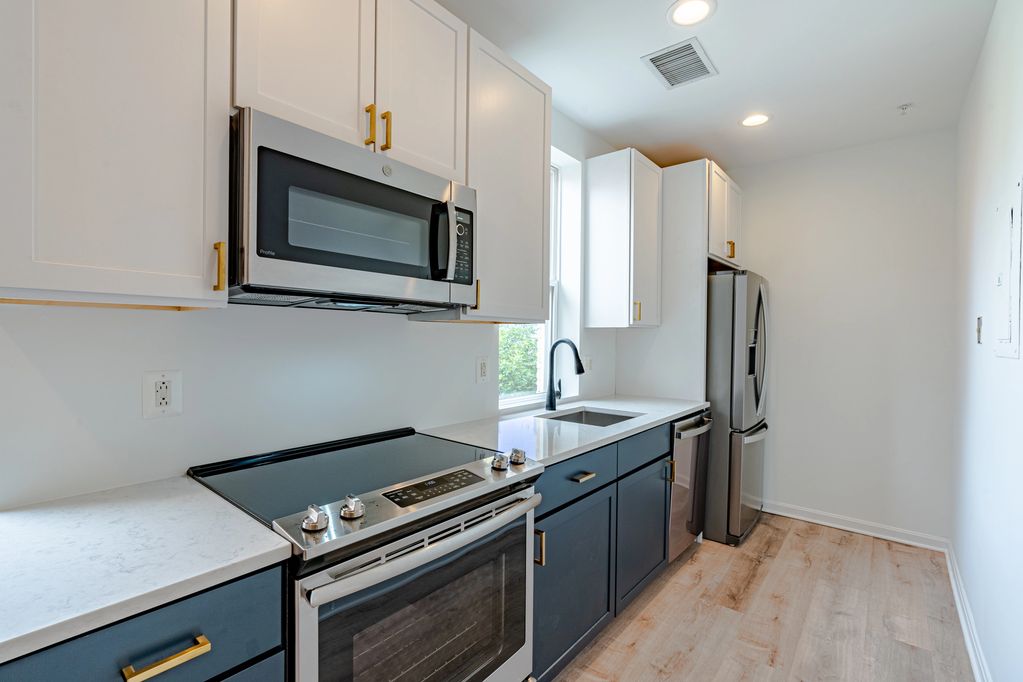 Nice galley kitchen with plenty of natural light off of a spacious living space.