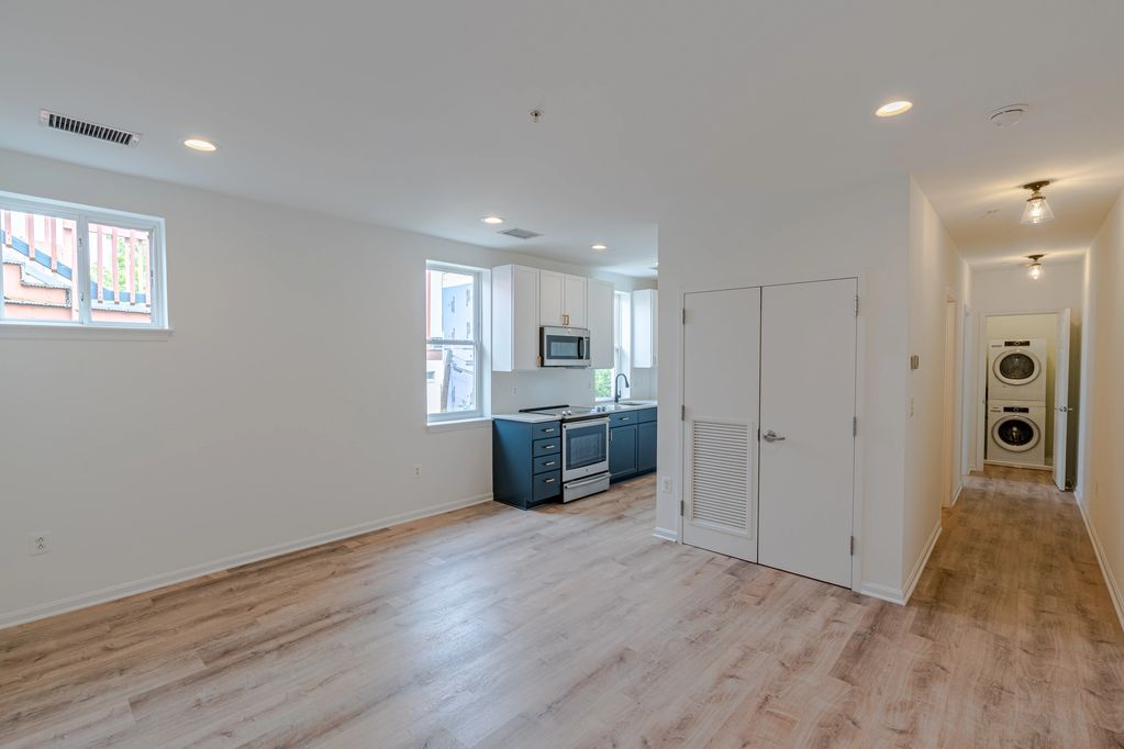 Compact washer and condenser dryer in closet at end of hallway outside bedroom.